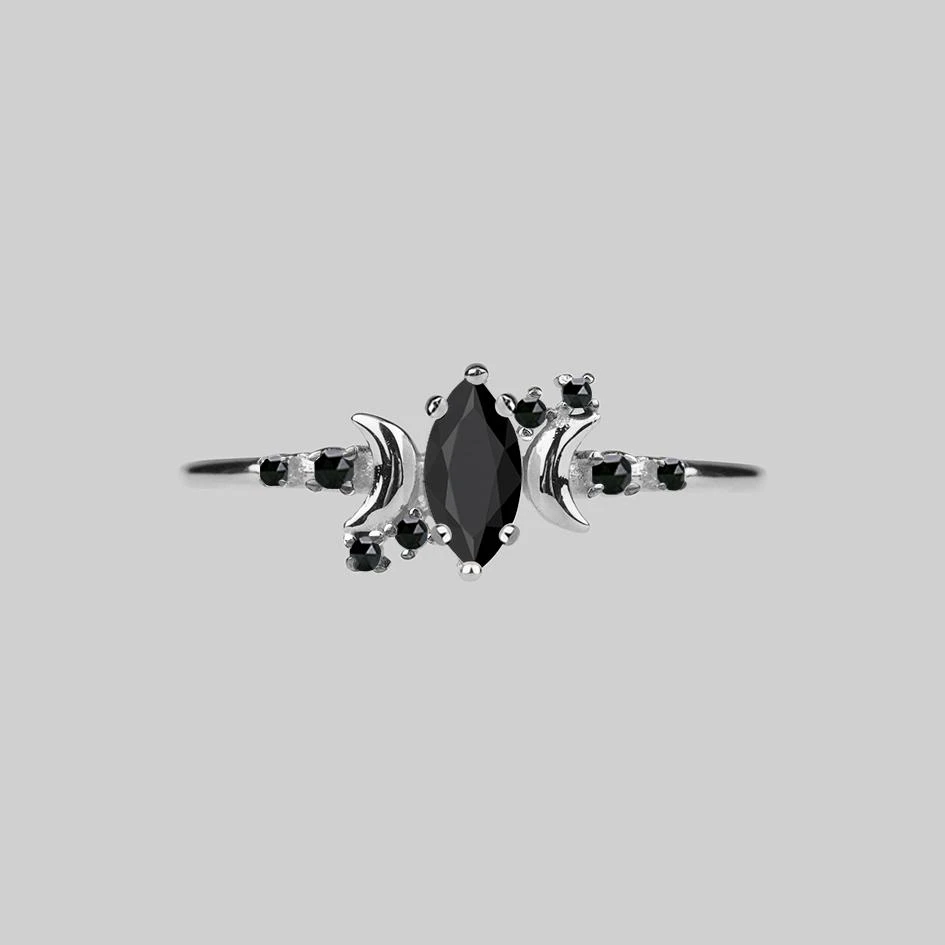A magical twist on a classic cluster ring. A central Black Spinel gemstone with two little moon symbols and tiny Black Spinel stars complete this design.