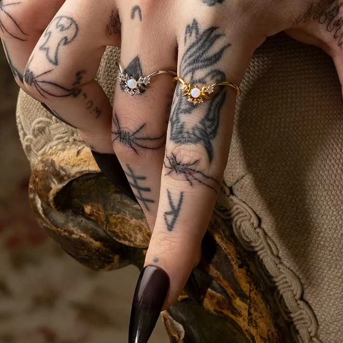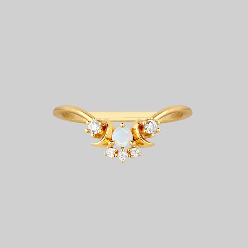 Celestial Opal ring featuring tiny symmetrical moon crescents and Cubic Zirconia stars.