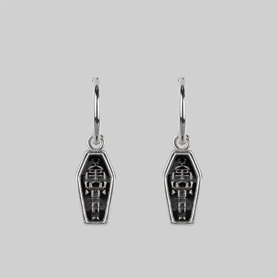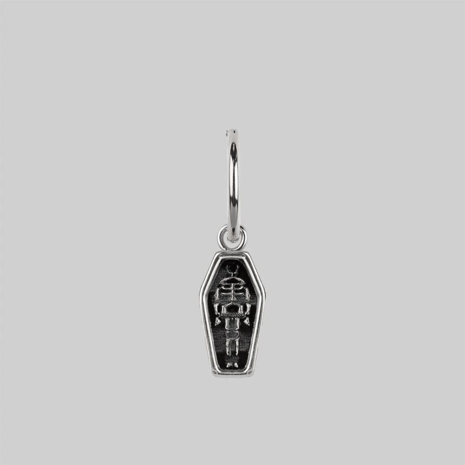 Delicate hoop earrings featuring tiny coffin charms encapsulating a delicate skeleton set behind enamel. Inspired by Mourning Jewellery worn to express the sentiment of death.