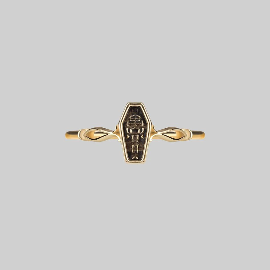 Delicate scroll shoulders hold a tiny coffin encapsulating a delicate skeleton. Inspired by Mourning Rings worn to express the sentiment of death.