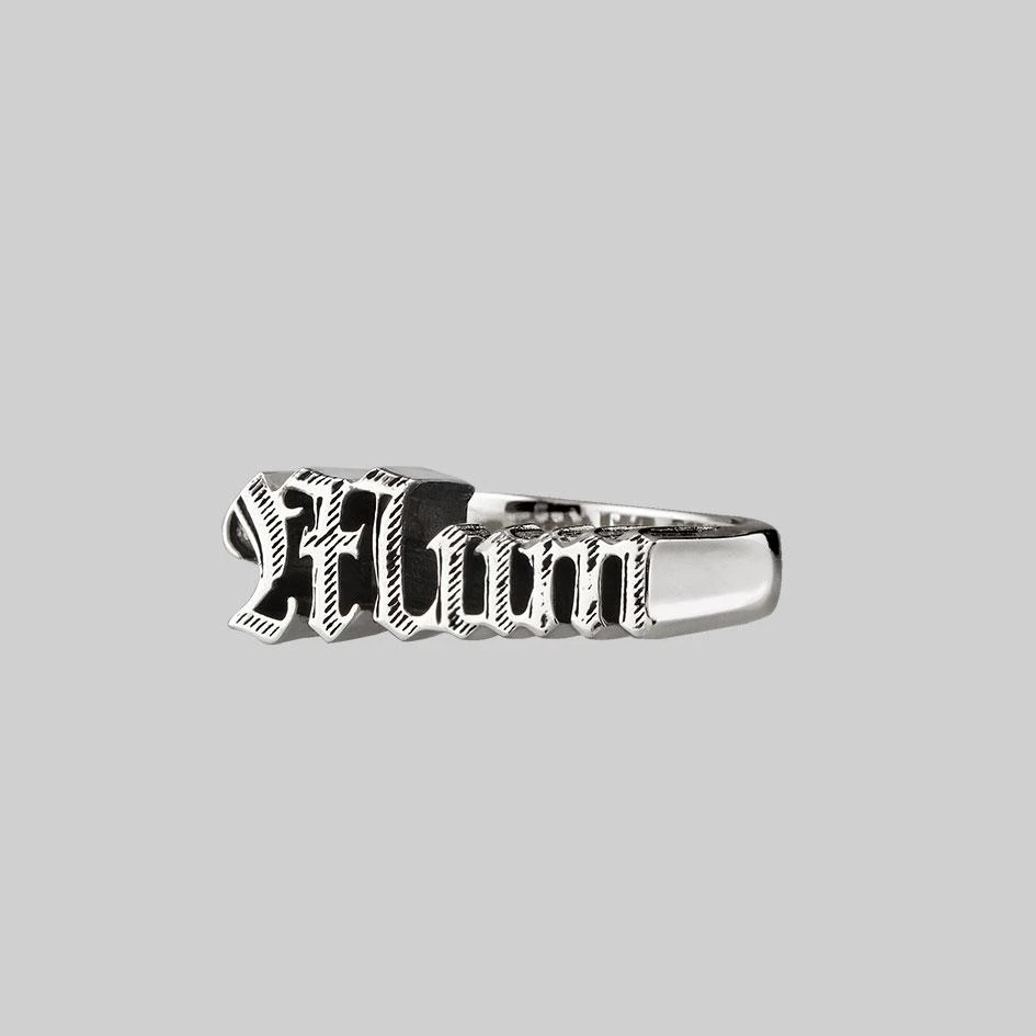 Old English gothic lettering Mum ring. Chunky, detailed letters for an authentic vintage style. Not just for Mums; wear in honour of your Mum too.