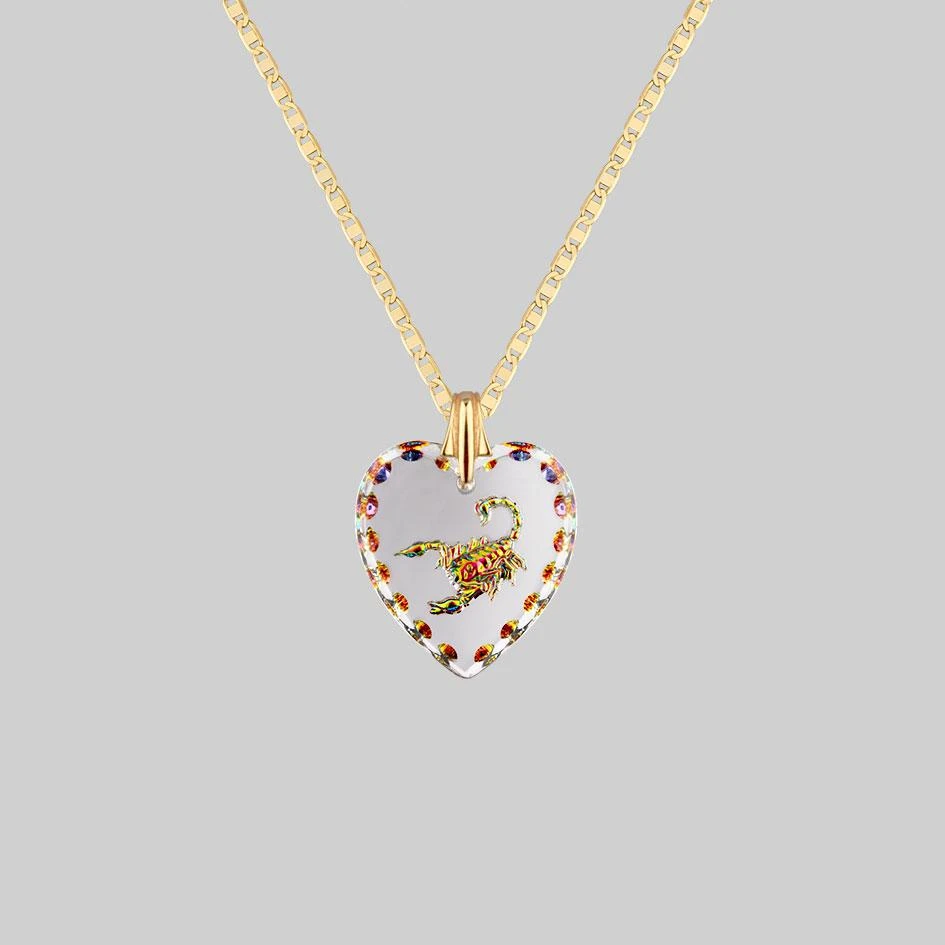 Glass heart Intaglio featuring an engraved iridescent scorpion, hangs from a delicate Mariner chain. This necklace can be worn either way around, showing the engraving from the front, or turned around; showing the engraving through the glass.