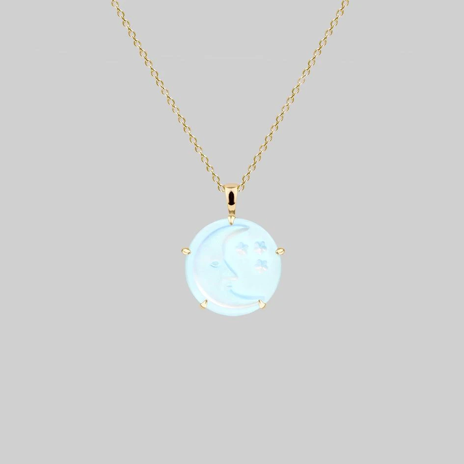 Large round luminescent blue crystal with angelic moon and star detail sits within a claw pronged pendant hanging from a delicate trace chain. A show stopping glow.