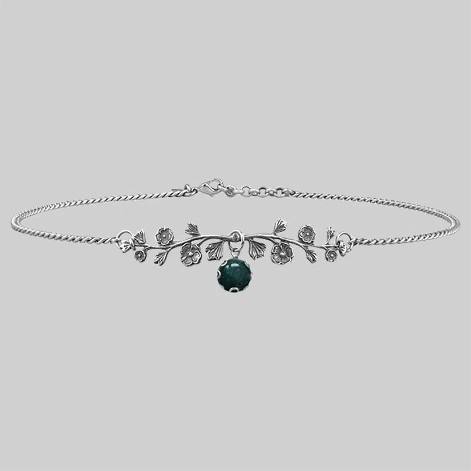Silver chain choker featuring wild rose detailing and a wild Green Moss gemstone centre.
