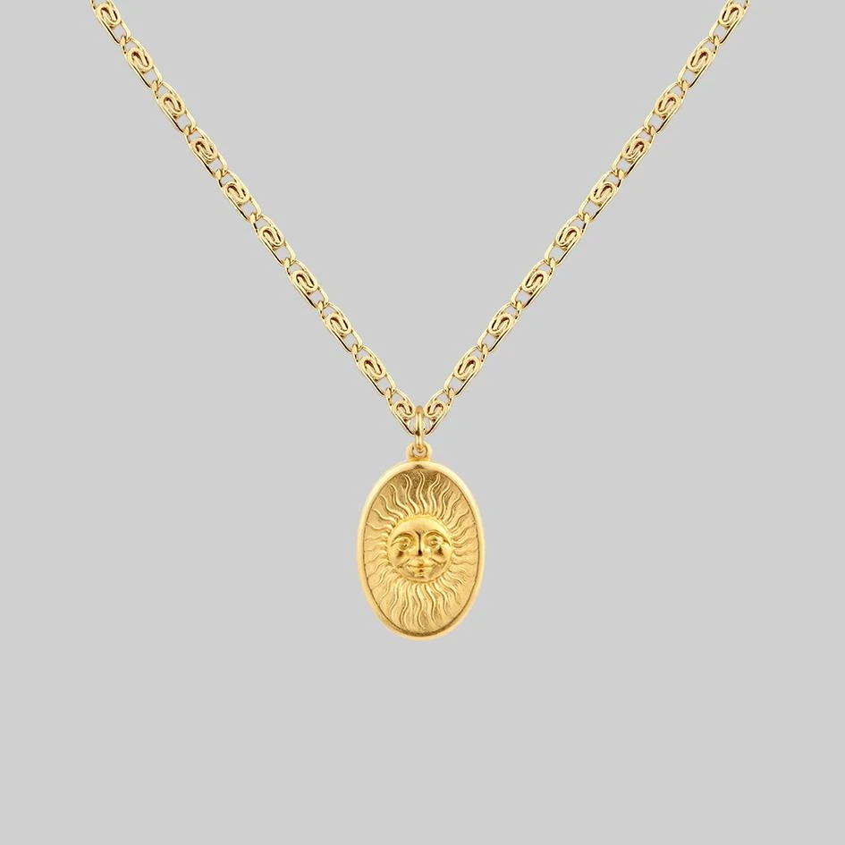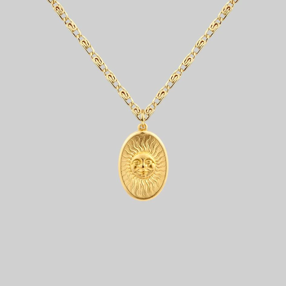 Oval celestial sun medallion with sweet little face detail hangs from a decorative snail chain.