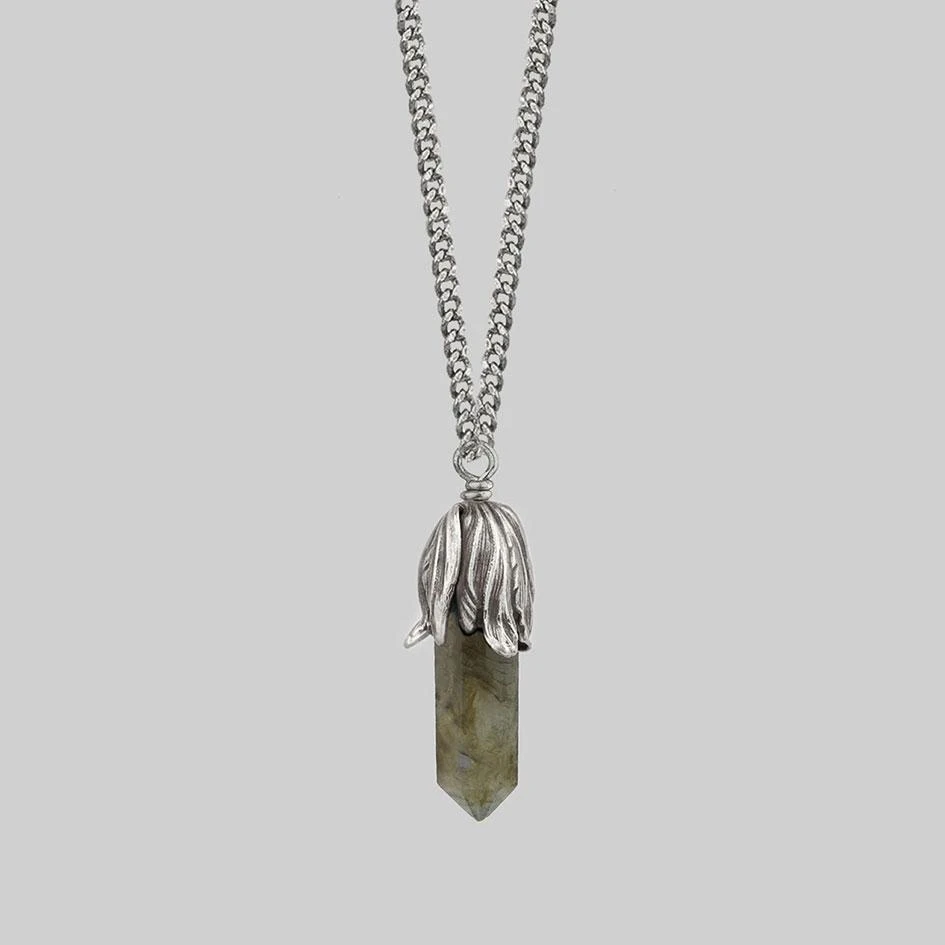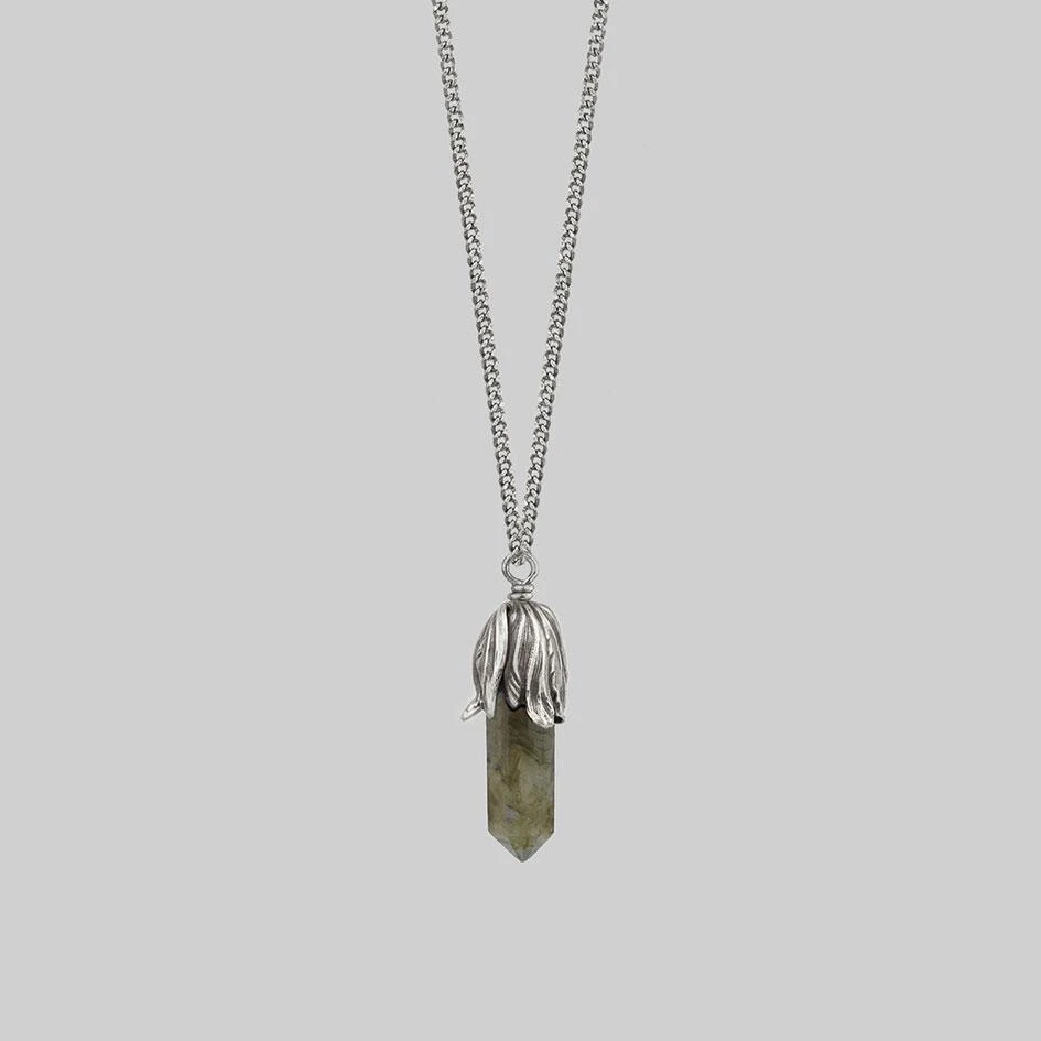 Labradorite gemstone shard encased within flourishing wild petals, hangs on a short adjustable chain.