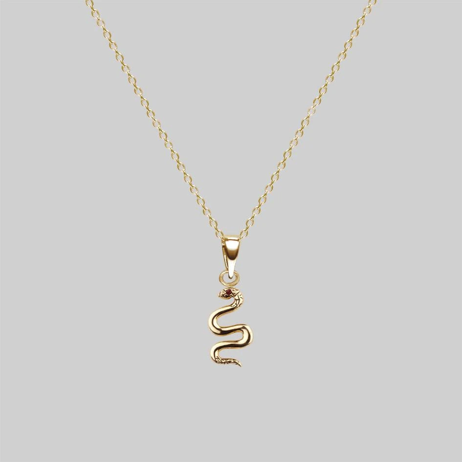 Delicate necklace featuring a tiny snake with deep red Garnet gemstone set eye.