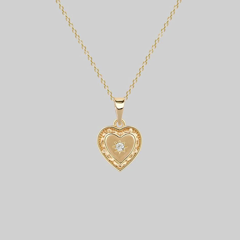 Romantic heart necklace featuring a starburst set tiny Cubic Zirconia crystal center.