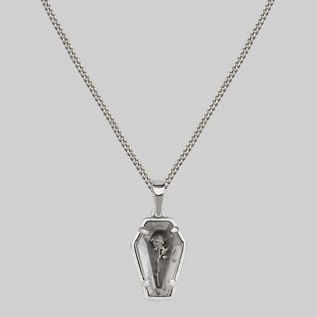 3D Rose under glass coffin necklace. A delicately detailed single rose lies framed under faceted Cubic Zirconia. A single black rose symbolises death and renewal.