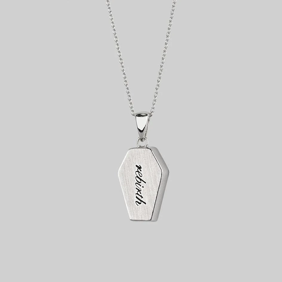 The word ‘rebirth’ is inscribed on the back of the coffin.