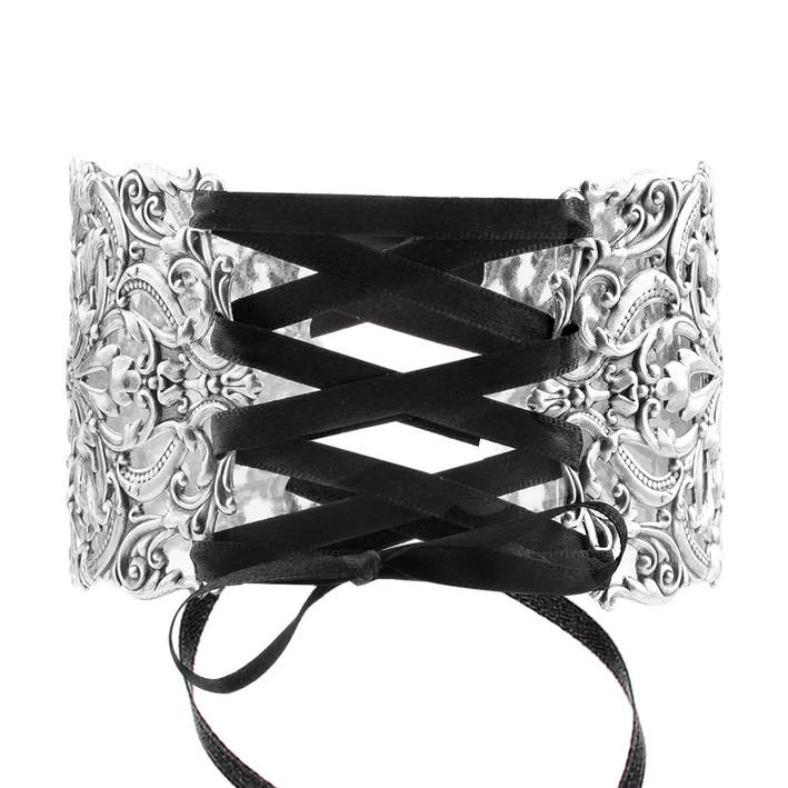 Grand Baroque lace up choker. Ornate antique silver detailing with satin ribbon lace up front and back.