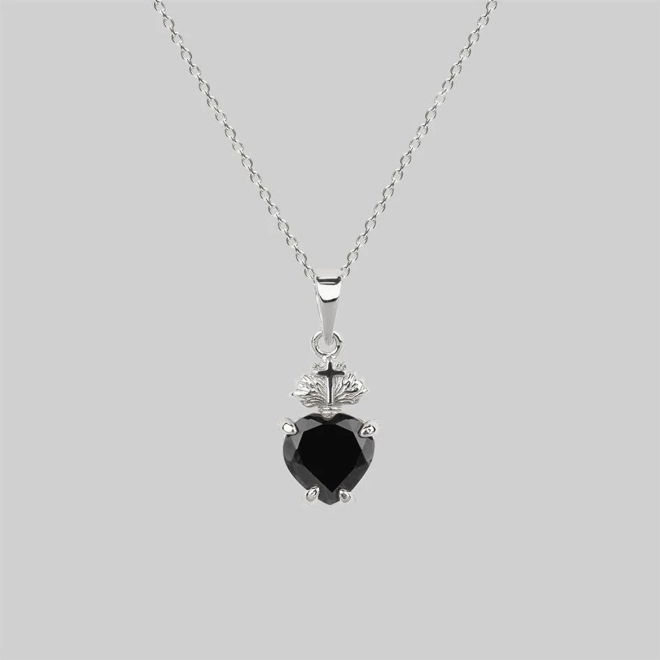 Delicate Sacred Heart necklace featuring a dark Black Spinel faceted heart gemstone.