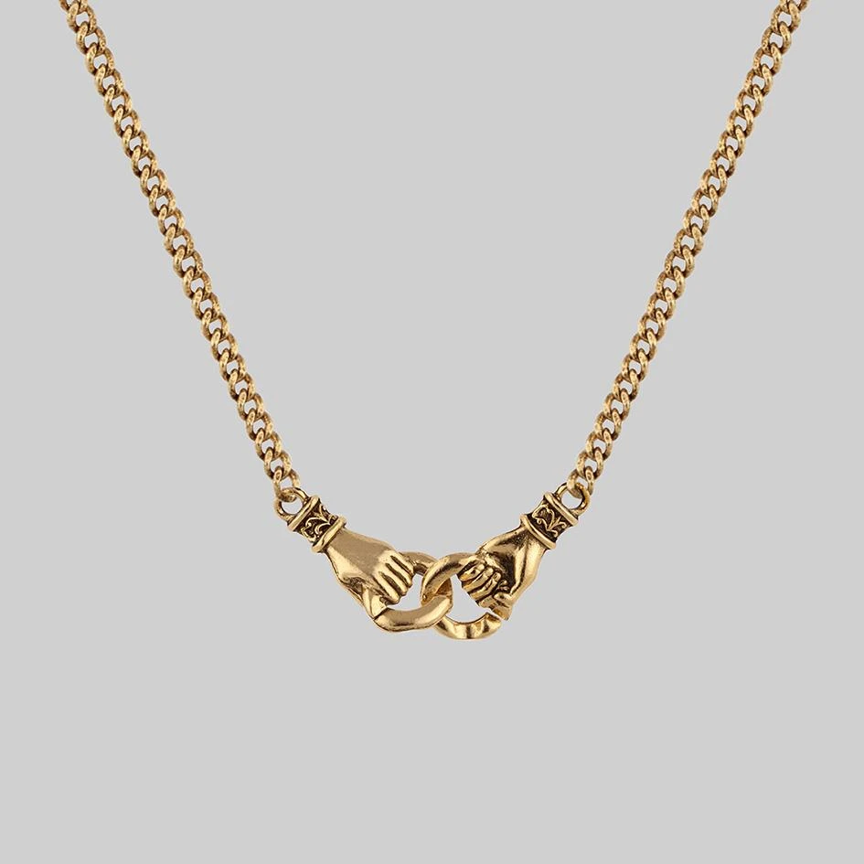 Curb chain necklace featuring two interlocking hands, representing unity and peace.