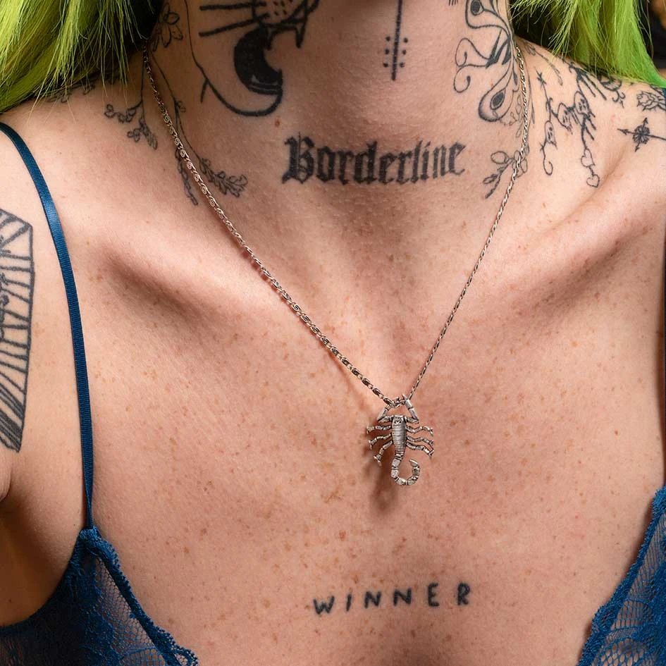 Fierce scorpion pendant hangs from a decorative snail chain.