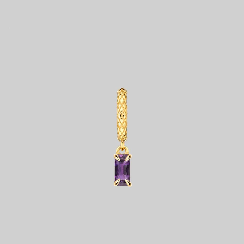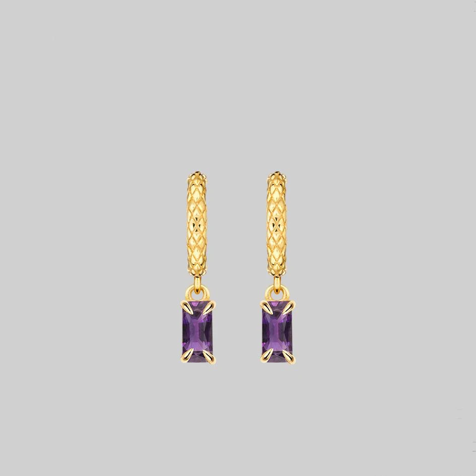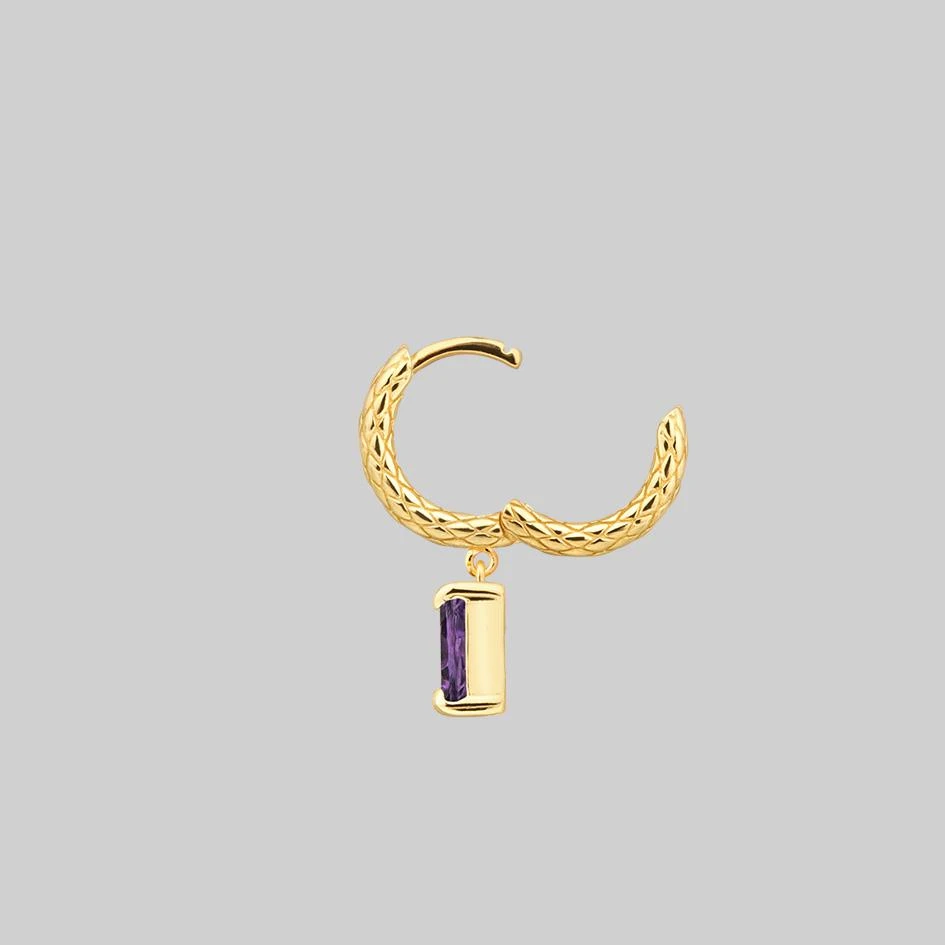 Detailed snake skin texture clicker hoop earrings featuring a dangly natural Amethyst gemstone.