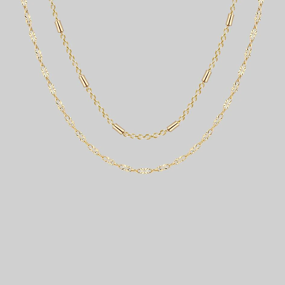 Delicate double chain layered gold necklace. The chains are joined at the clasp.