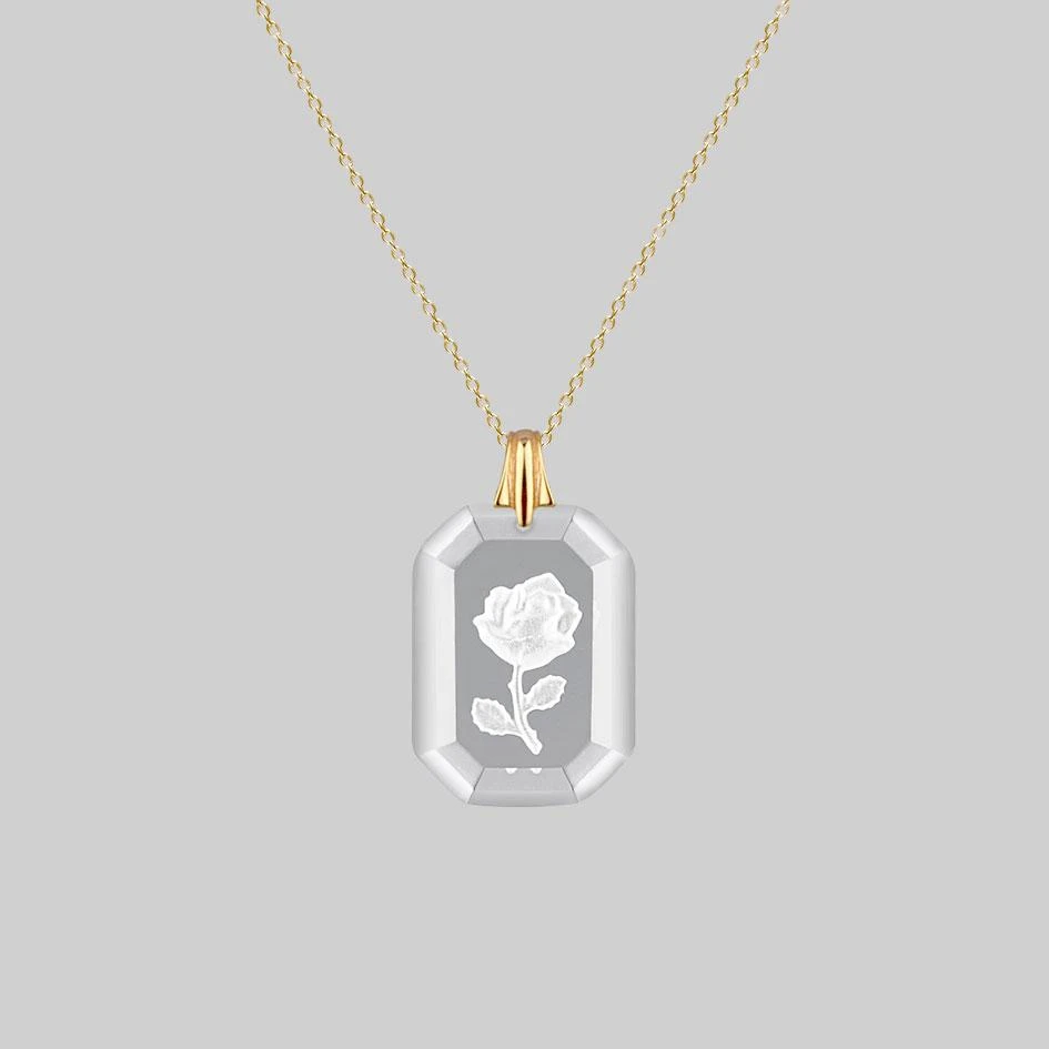 Vintage inspired Intaglio glass pendant featuring a single rose, hangs from a delicate trace chain. This necklace can be worn either way around, showing the engraving from the front, or turned around; showing the engraving through the glass.