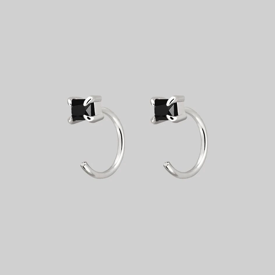 Silver huggie hoop earrings featuring a rectangle-cut Black Spinel gemstone. Simply pull the open hoop through your piercing to the end. Slightly adjustable.