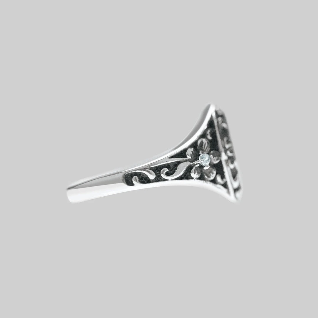Ornate framed initial ring from Letters A – M featuring two tiny Cubic Zirconia crystals encrusted within dark intricate detailing.