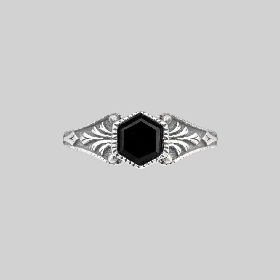 Vintage inspired ring featuring ornately decorated shoulders around a bezel set hexagon cut Onyx gemstone.