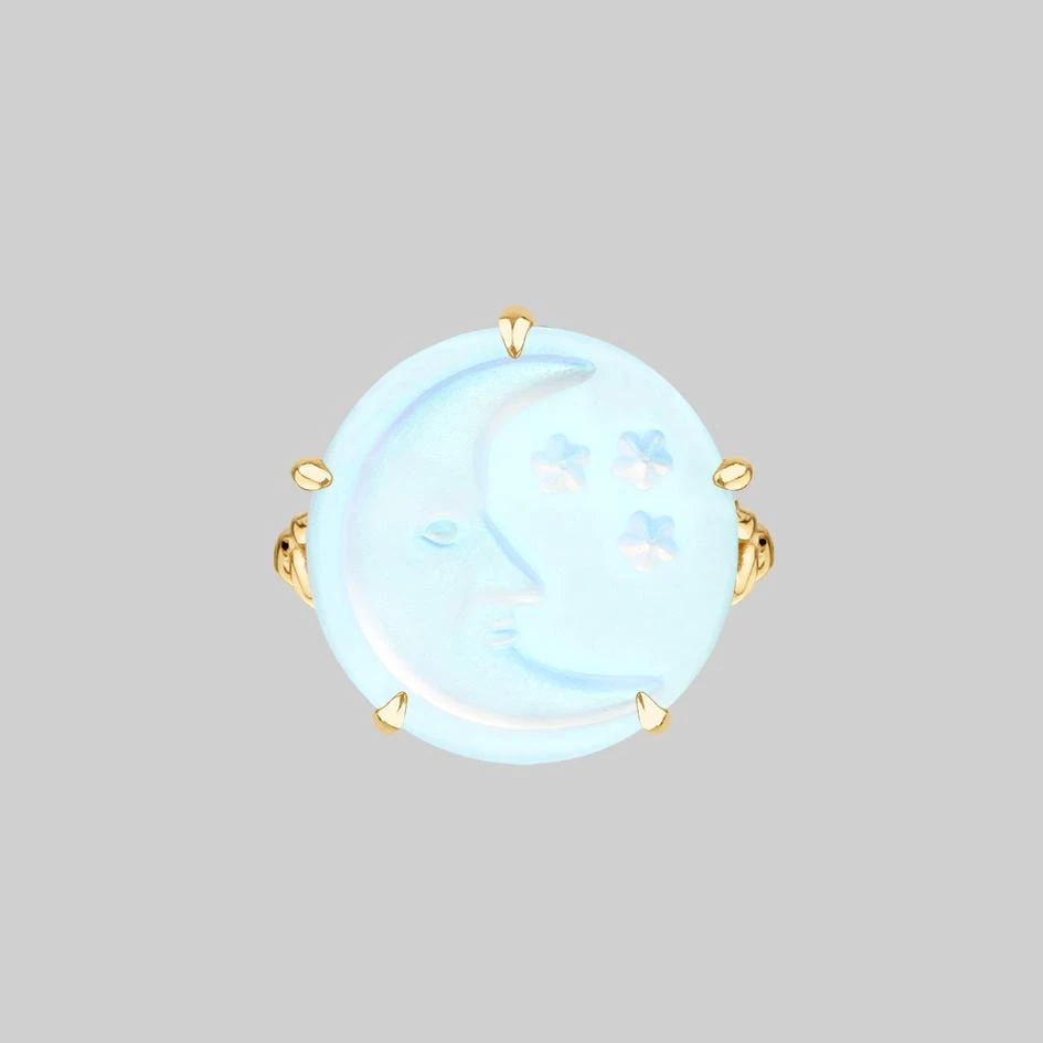 Large round luminescent blue crystal with angelic moon and star detail sits within a claw pronged twisted style ring. A show stopping glow.