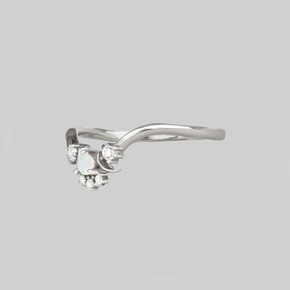 Celestial Opal ring featuring tiny symmetrical moon crescents and Cubic Zirconia stars.