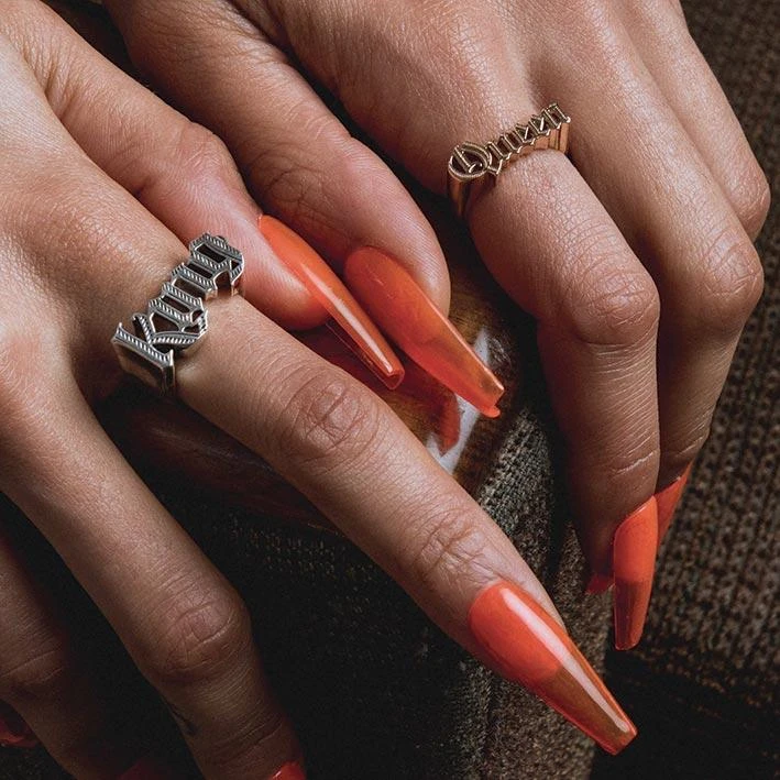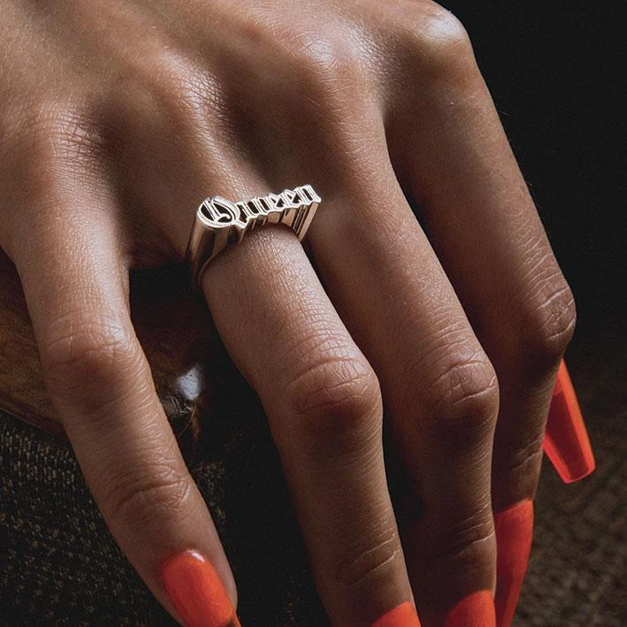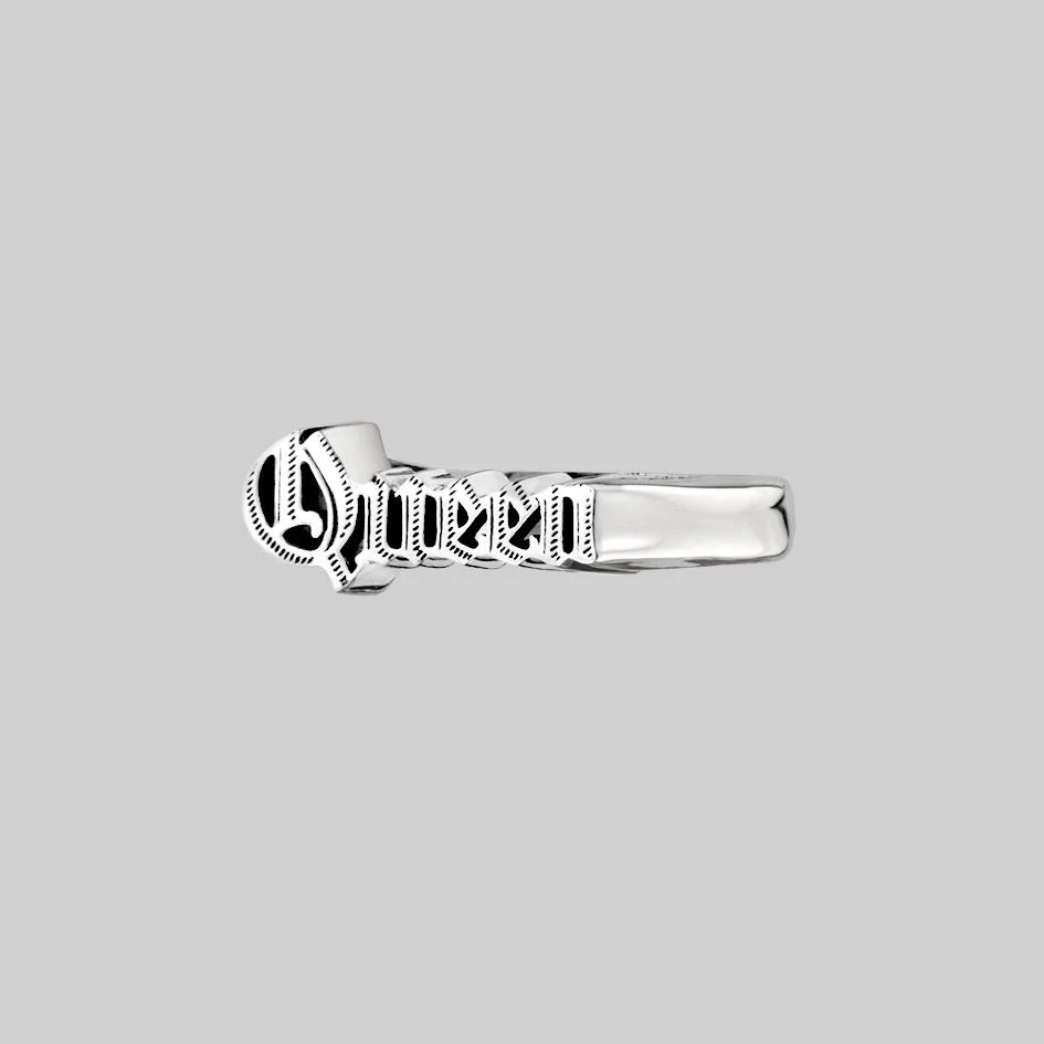 Regal old English gothic lettering Queen ring. Chunky, detailed letters for an authentic vintage style.