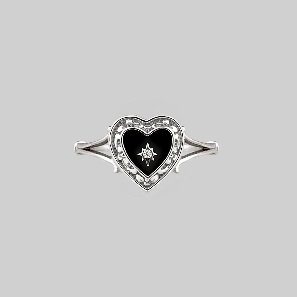 Vintage inspired dark heart ring. Ornate frame filled with black enamel set with a tiny cubic zirconia crystal sits between ornate shoulders.