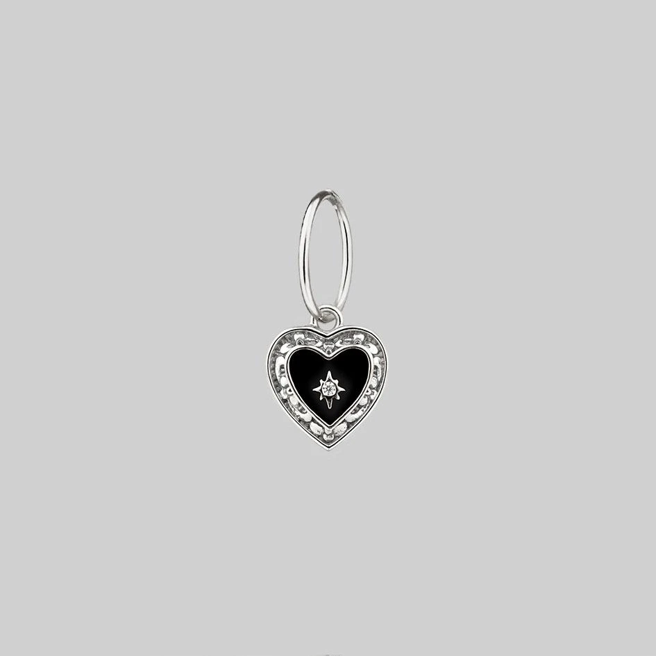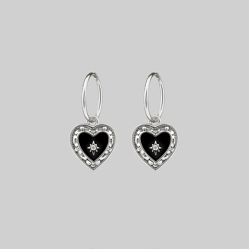 Vintage inspired dark heart earrings. Ornate frame filled with black enamel set with a tiny cubic zirconia crystal.