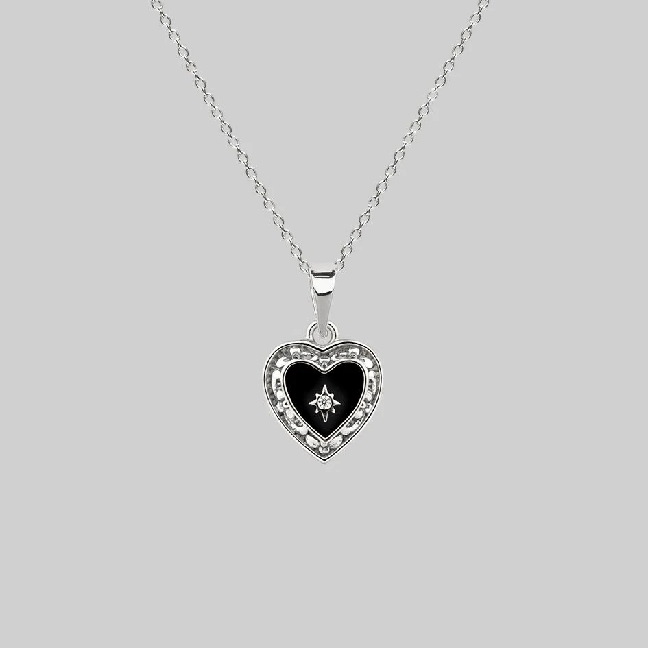 Vintage inspired heart necklace featuring a detailed frame with black enamel centre set with a tiny Cubic Zirconia crystal.