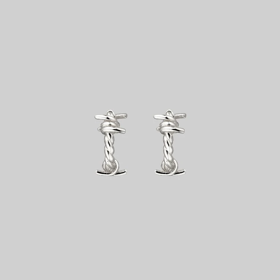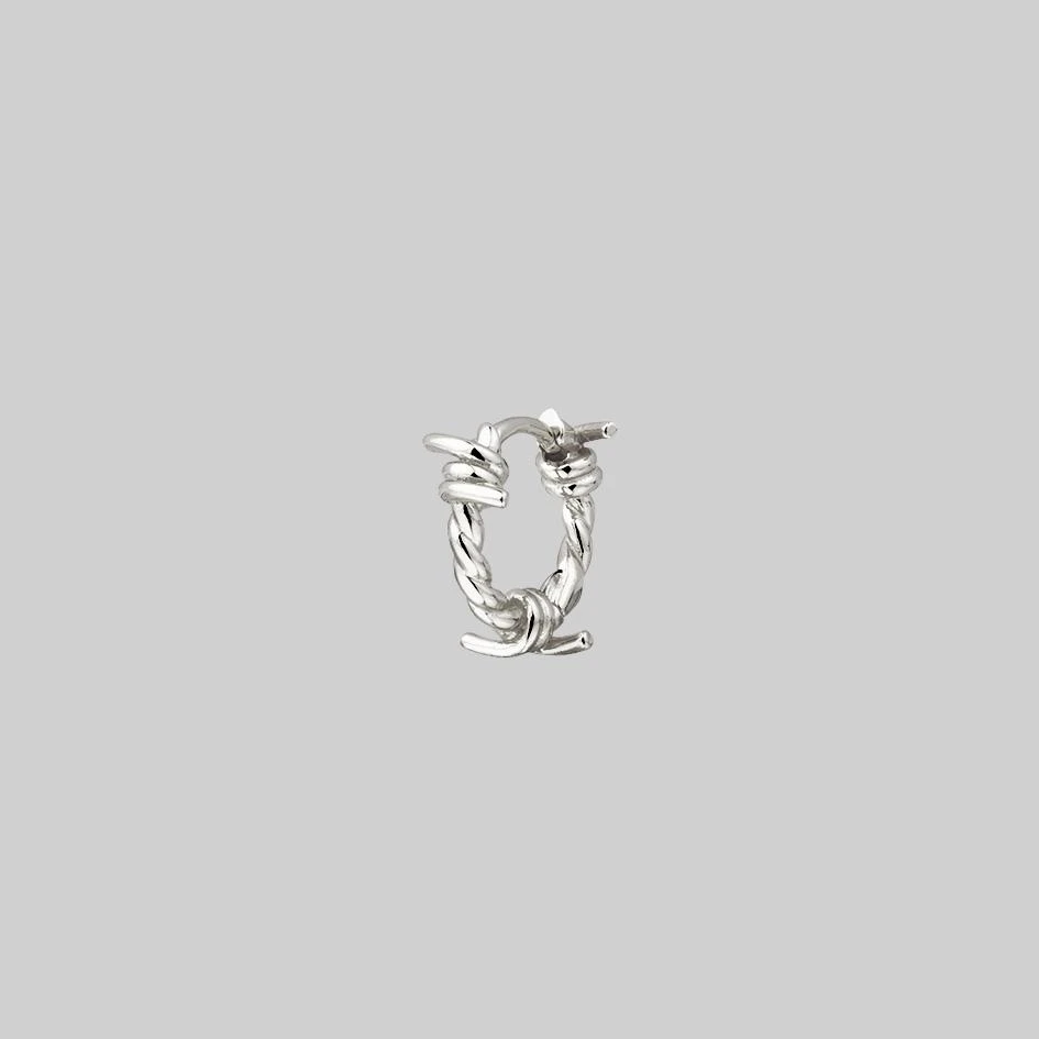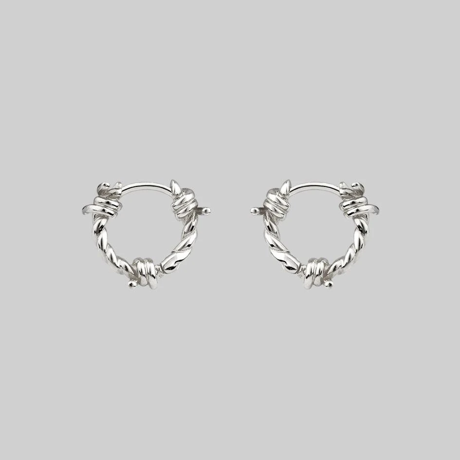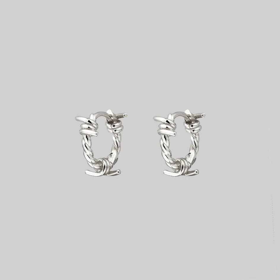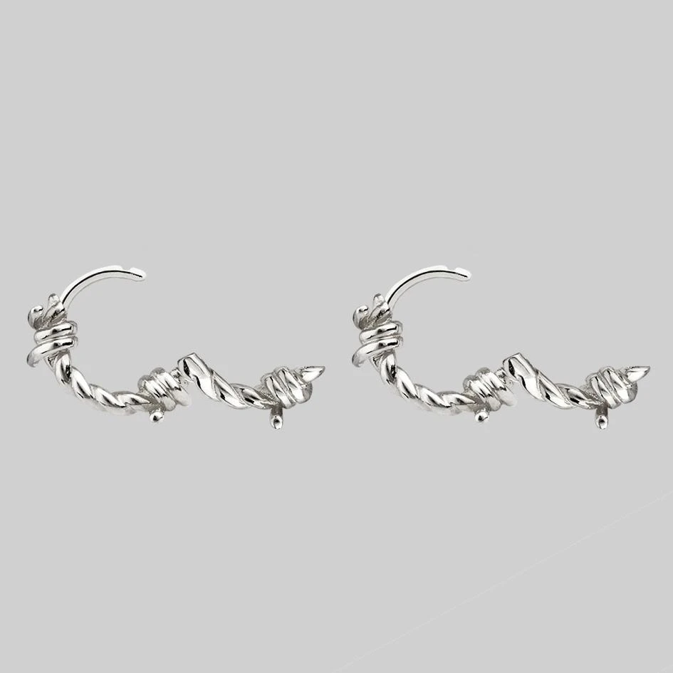Elegant and deadly. Silver twisted barbed wire hoop earrings.
