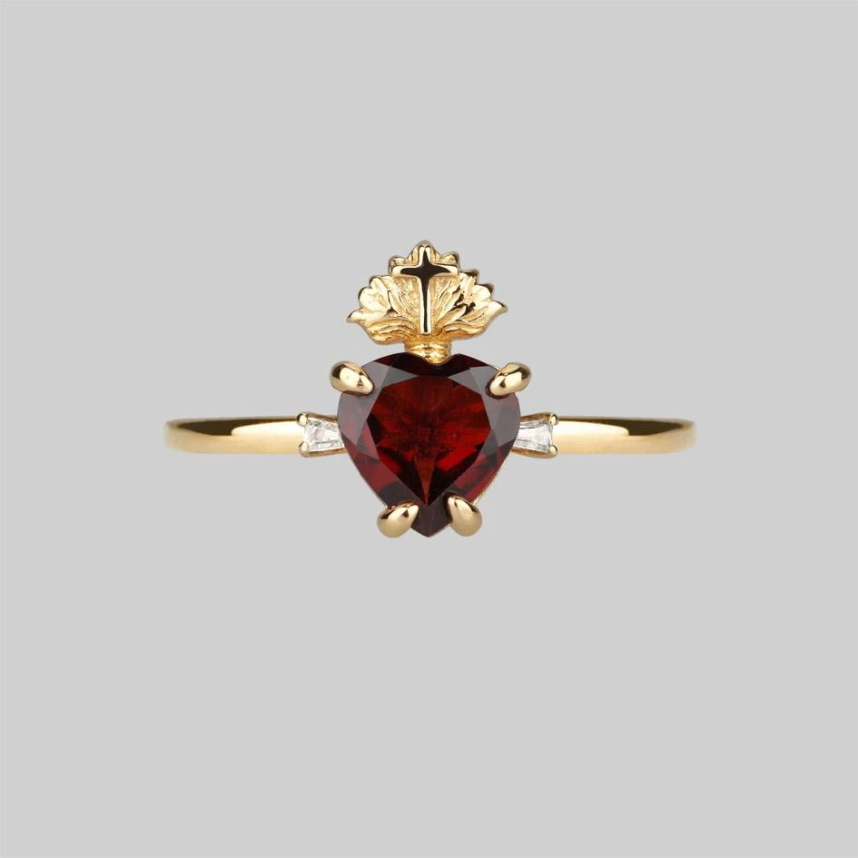 Delicate Sacred Heart ring featuring a deep red Garnet faceted heart gemstone and two Cubic Zirconia crystals.