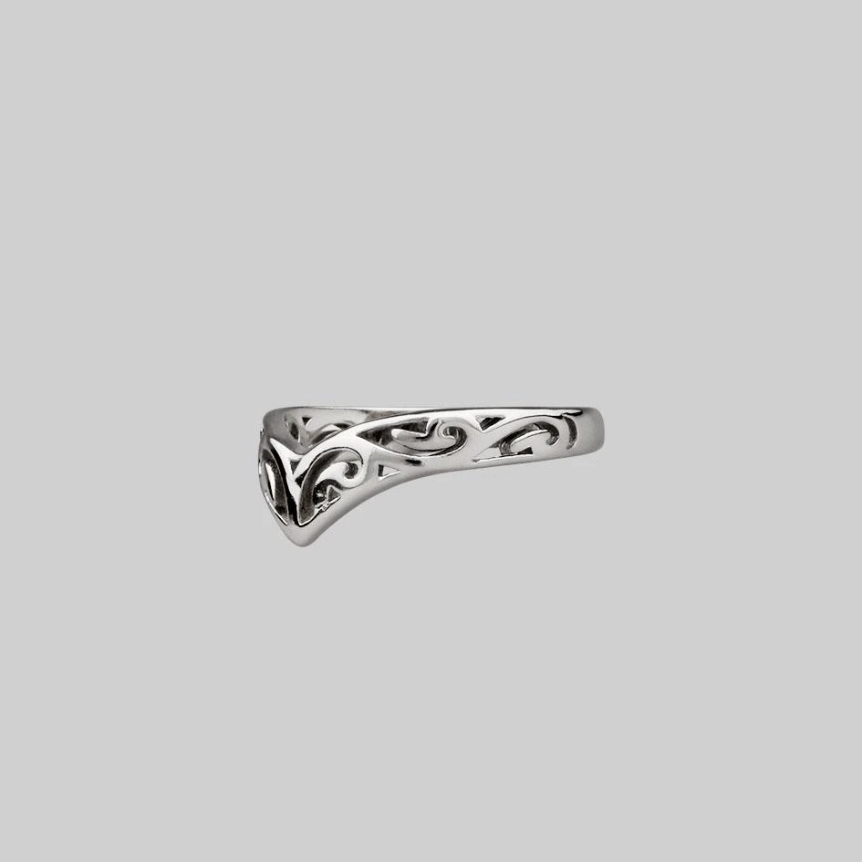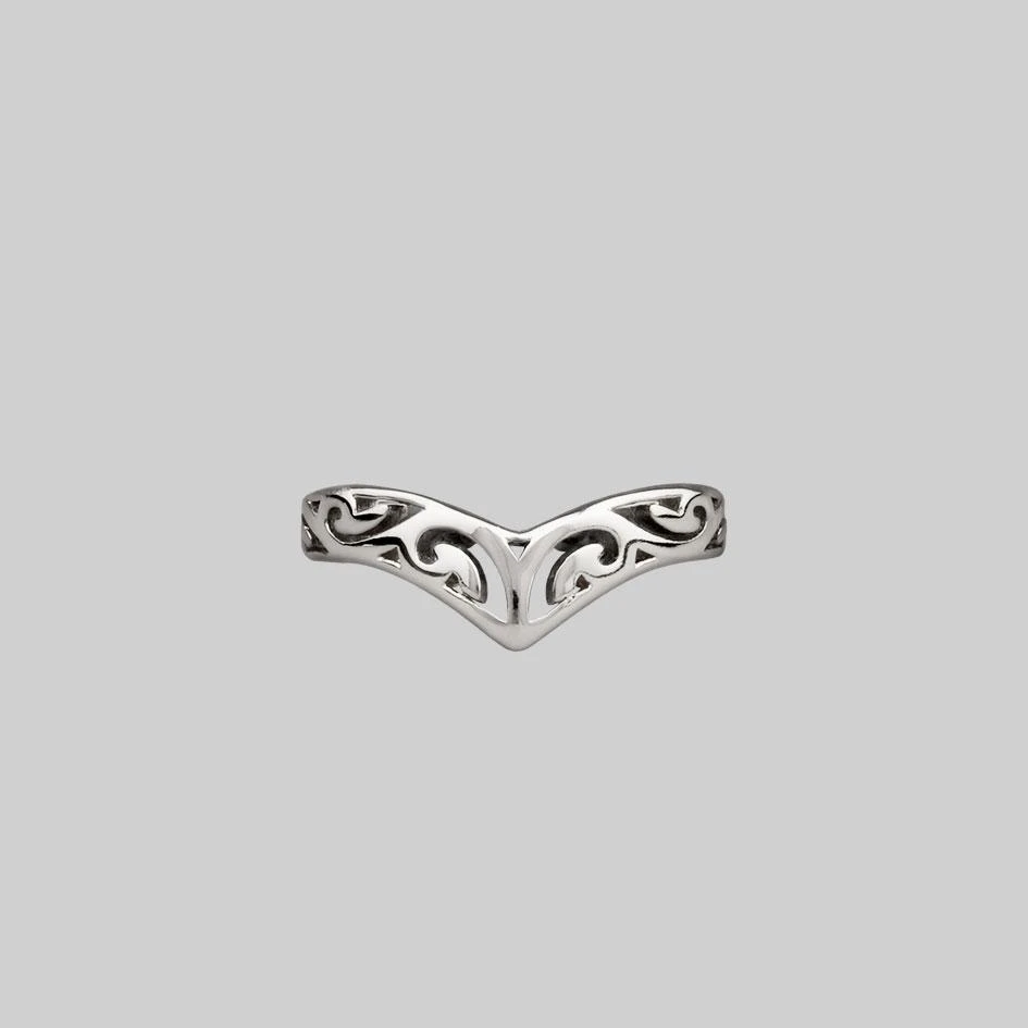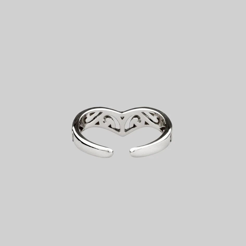 Silver chevron toe ring with cut out intricate swirl detail.