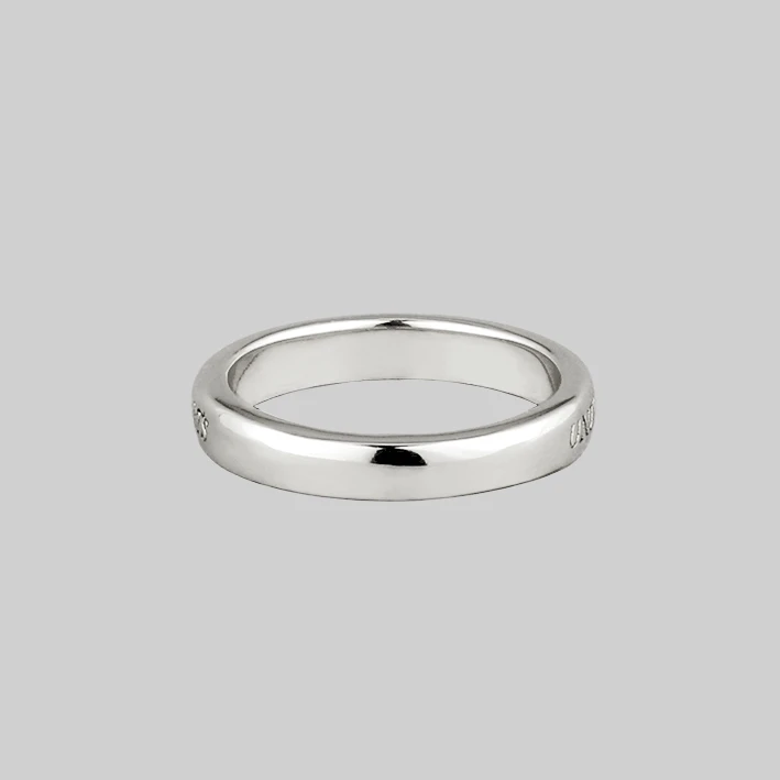 Smooth silver band ring featuring the words United Hearts Death Only Parts inscribed in an old English gothic font. Inside the ring band features a tiny Skull.