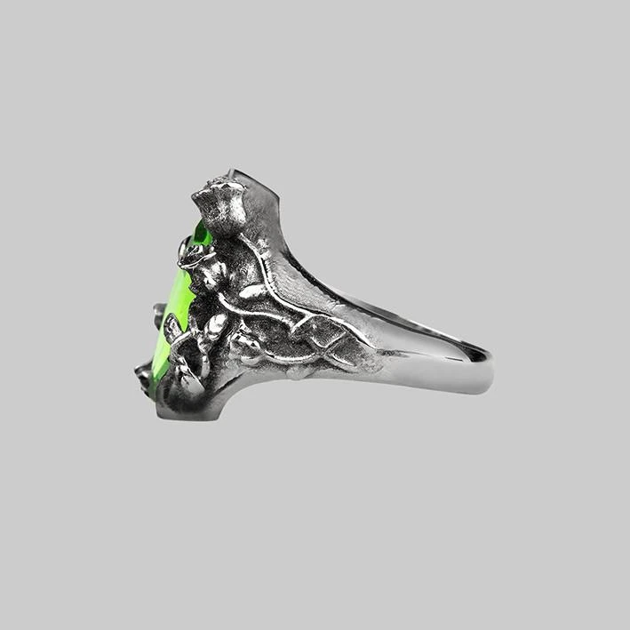 Dark enchanted foliage of rose buds and poison ivy surround a glowing green SWAROVSKI™ crystal. CAUTION: Serious glow.