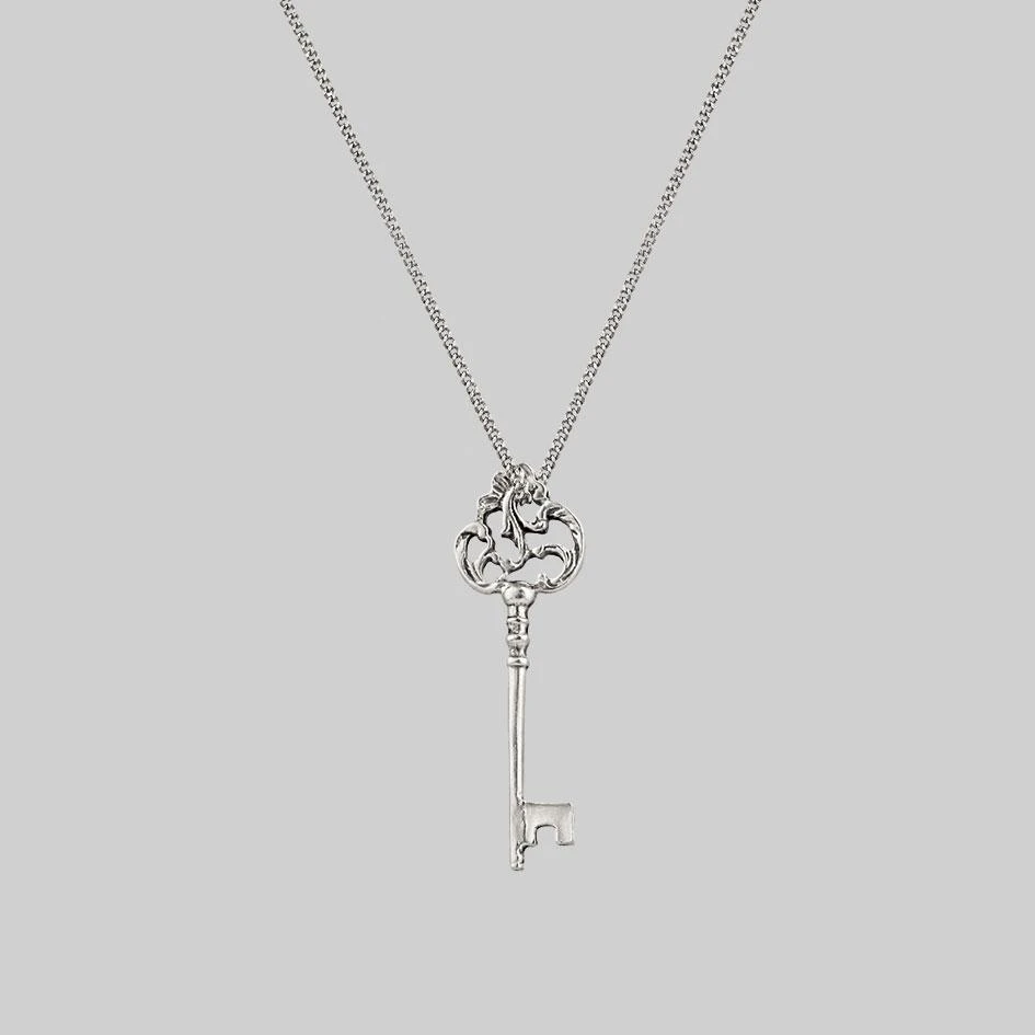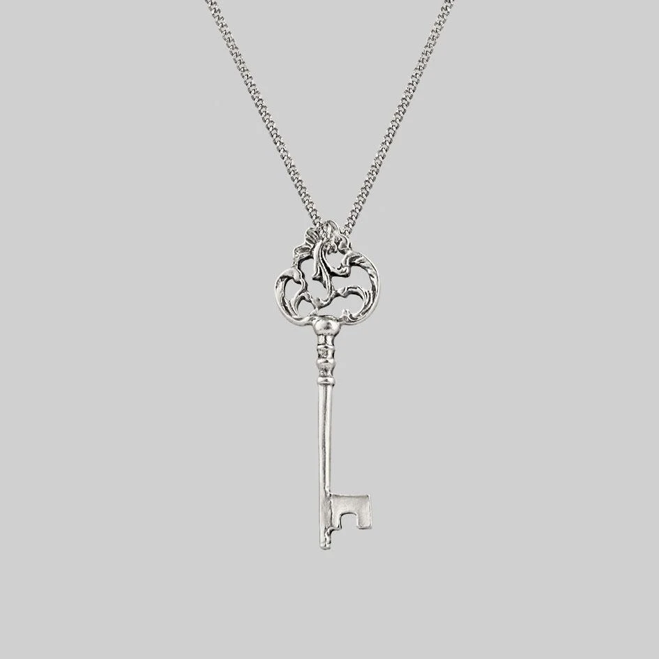 Ornate darkly detailed key hangs on a delicate curb chain.