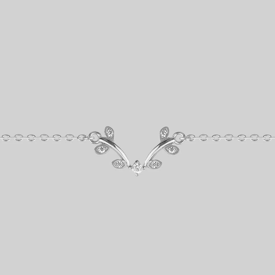 Sterling Silver dainty chain choker featuring a delicate twine of leaves, each encrusted with Cubic Zirconia crystal.