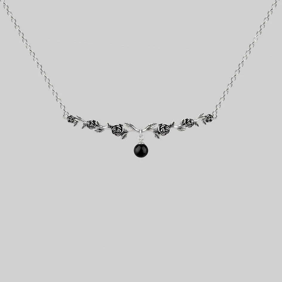 Silver collar necklace featuring detailed wild rose branches and a sphere of Black Spinel gemstone. Designed to sit just above your collar bone.