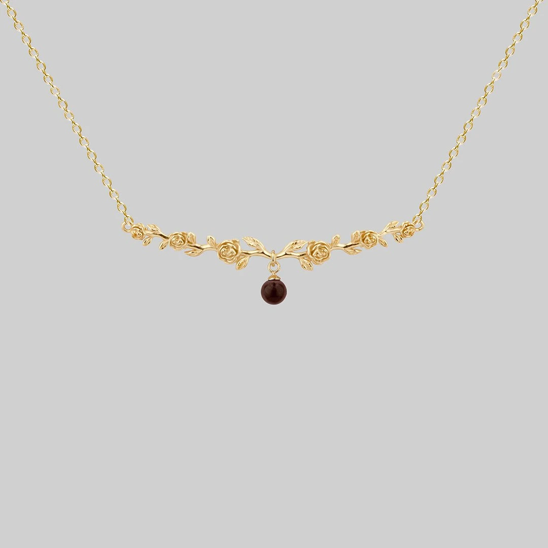 Gold collar necklace featuring detailed wild rose branches and a dark red sphere of Garnet gemstone. Designed to sit just above your collar bone.