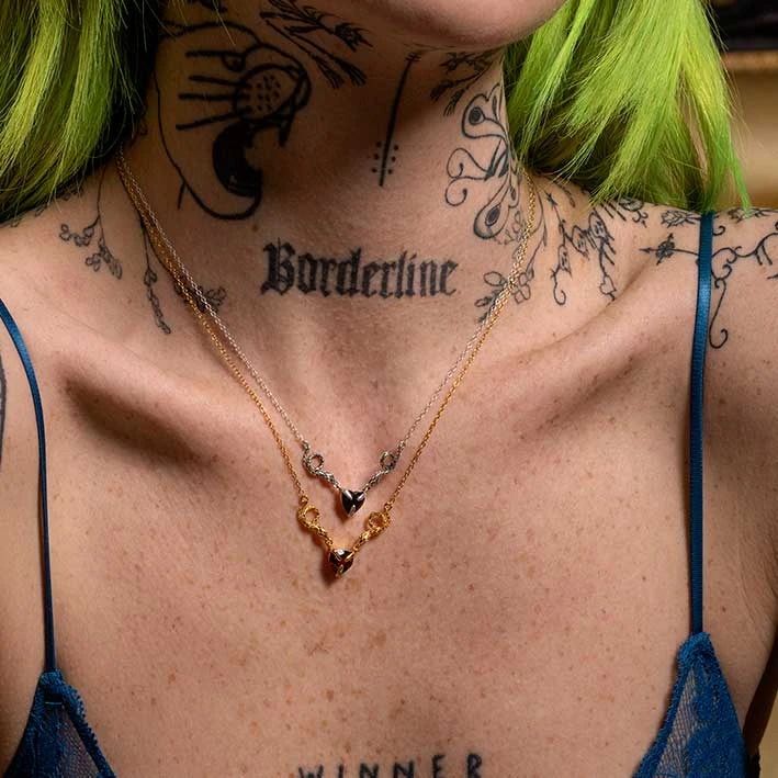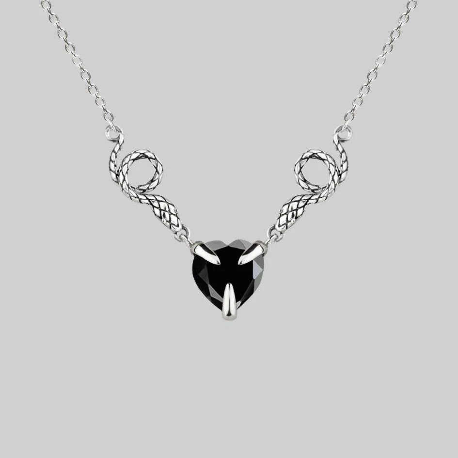 Darkly detailed double snake necklace with a central Black Onyx gemstone heart set within claw shaped prongs. Hangs from a delicate trace chain.