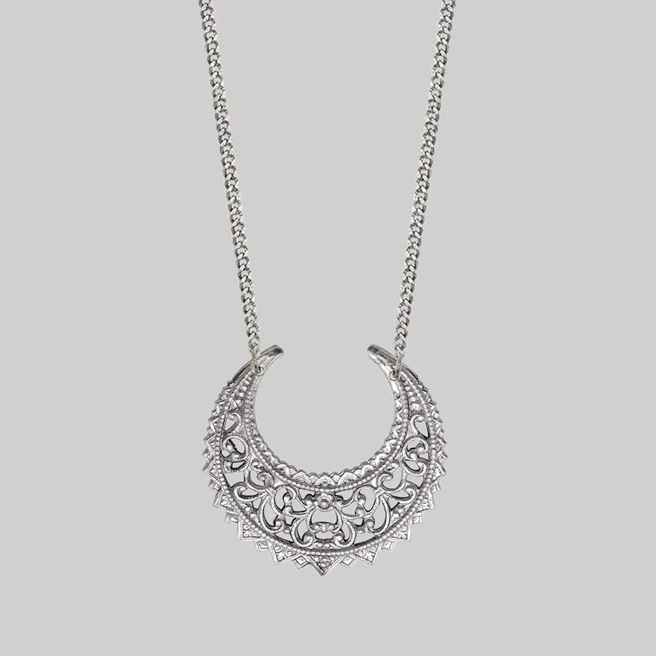 Beautifully intricate Eastern inspired crescent hangs on an adjustable chain.