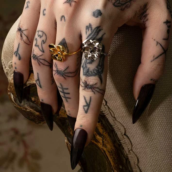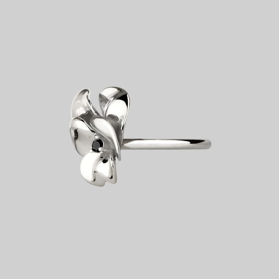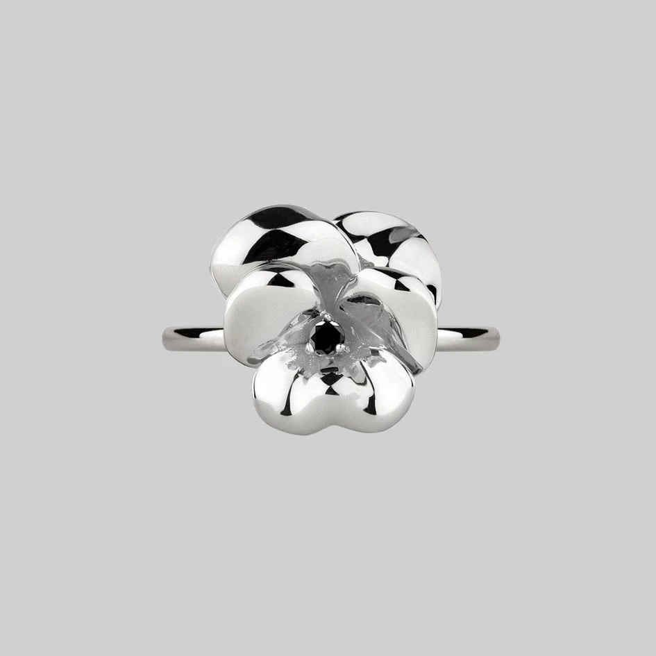 Silver statement pansy ring featuring a tiny Black Spinel gemstone centre.