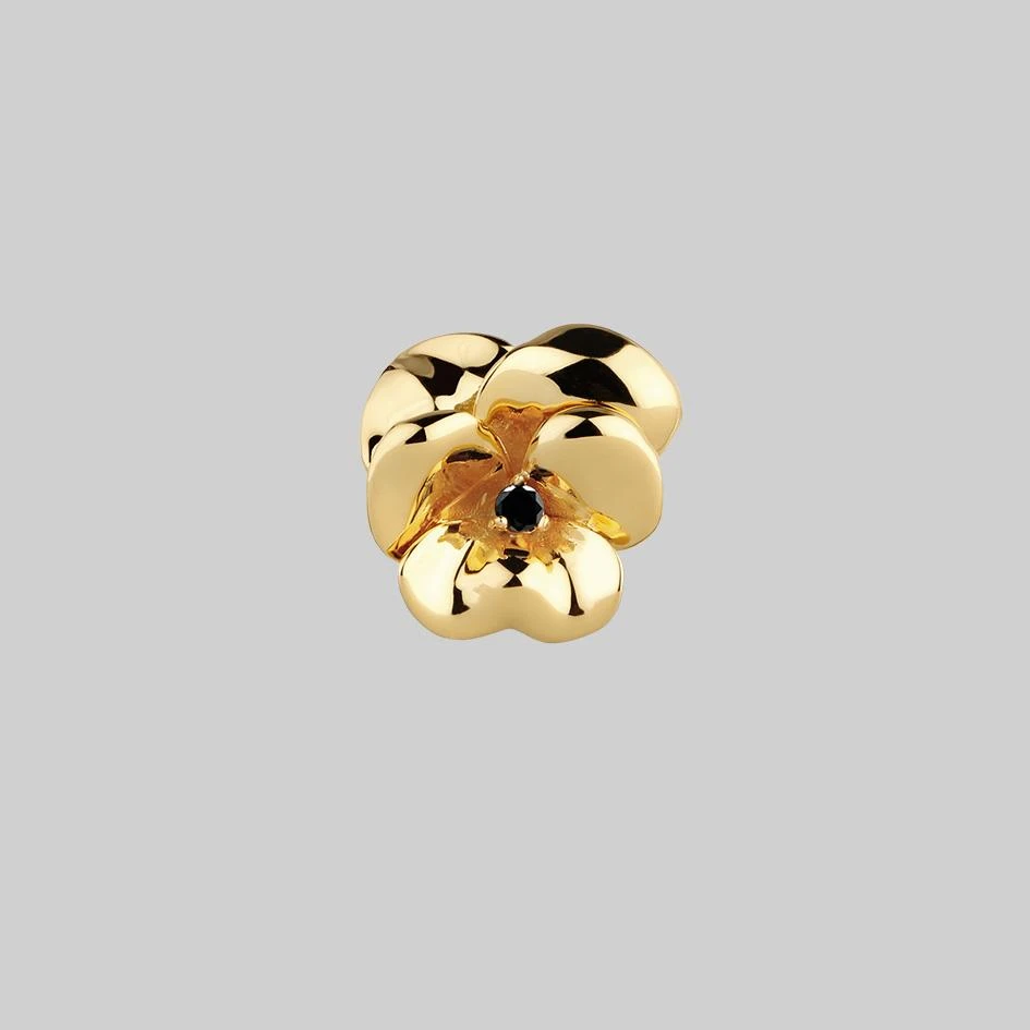Large gold pansy cartilage earring, featuring a tiny faceted Black Spinel gemstone centre. Tip: Try wearing in a conch piercing (ensure the height and width of the pansy will fit within this space on your ear first!).