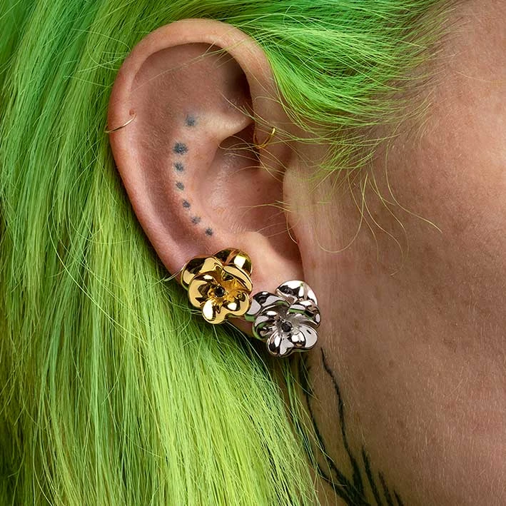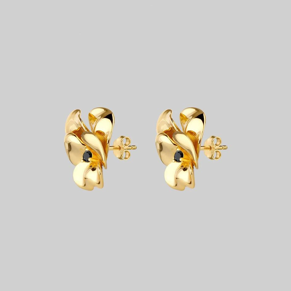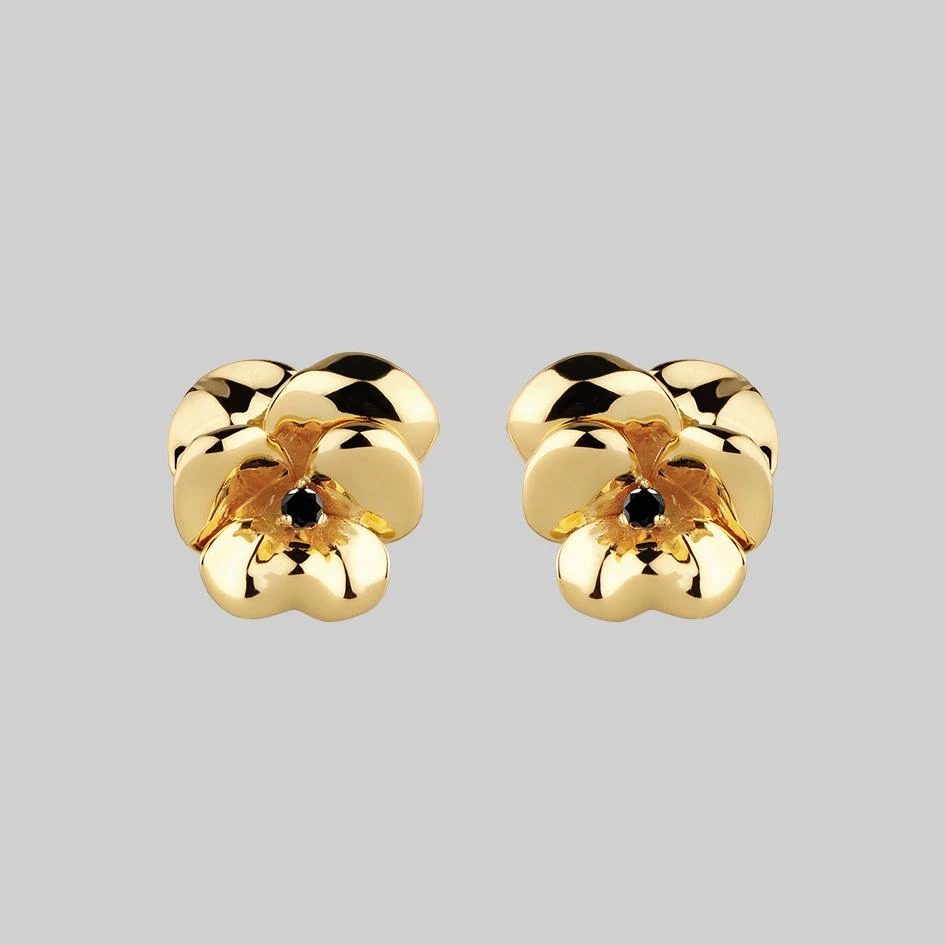 Large gold pansy earrings featuring a tiny Black Spinel gemstone centre.