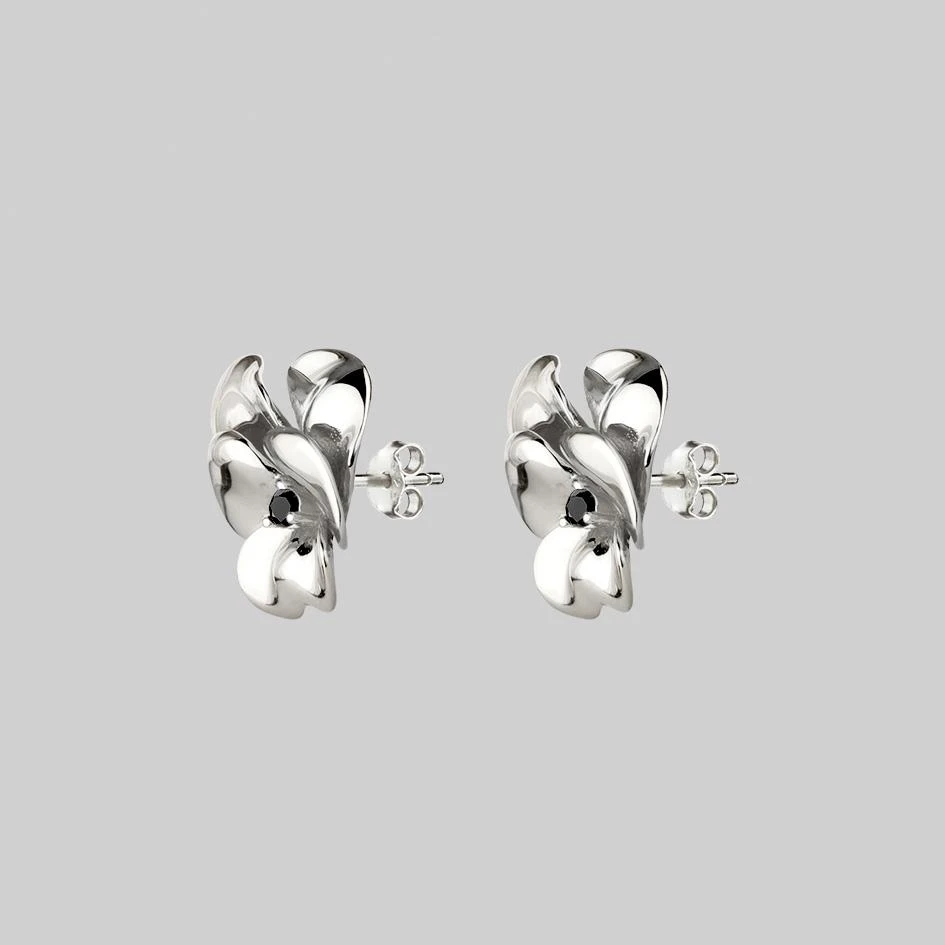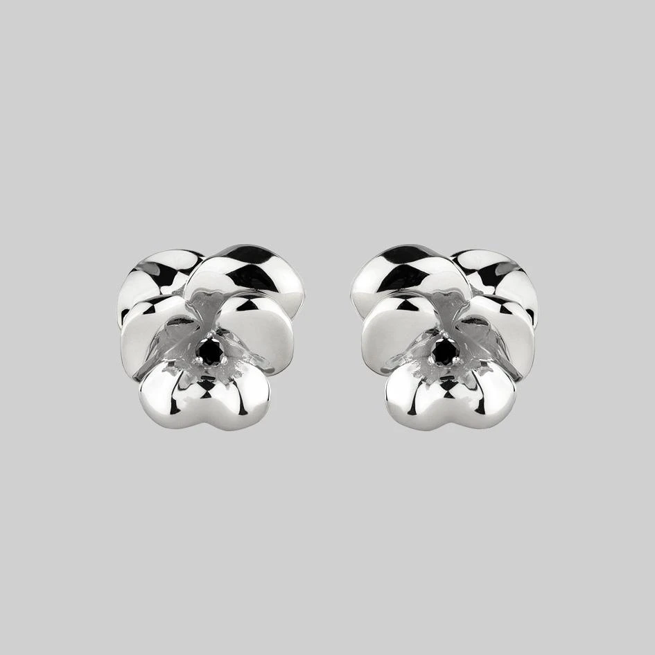 Large silver pansy earrings featuring a tiny Black Spinel gemstone centre.