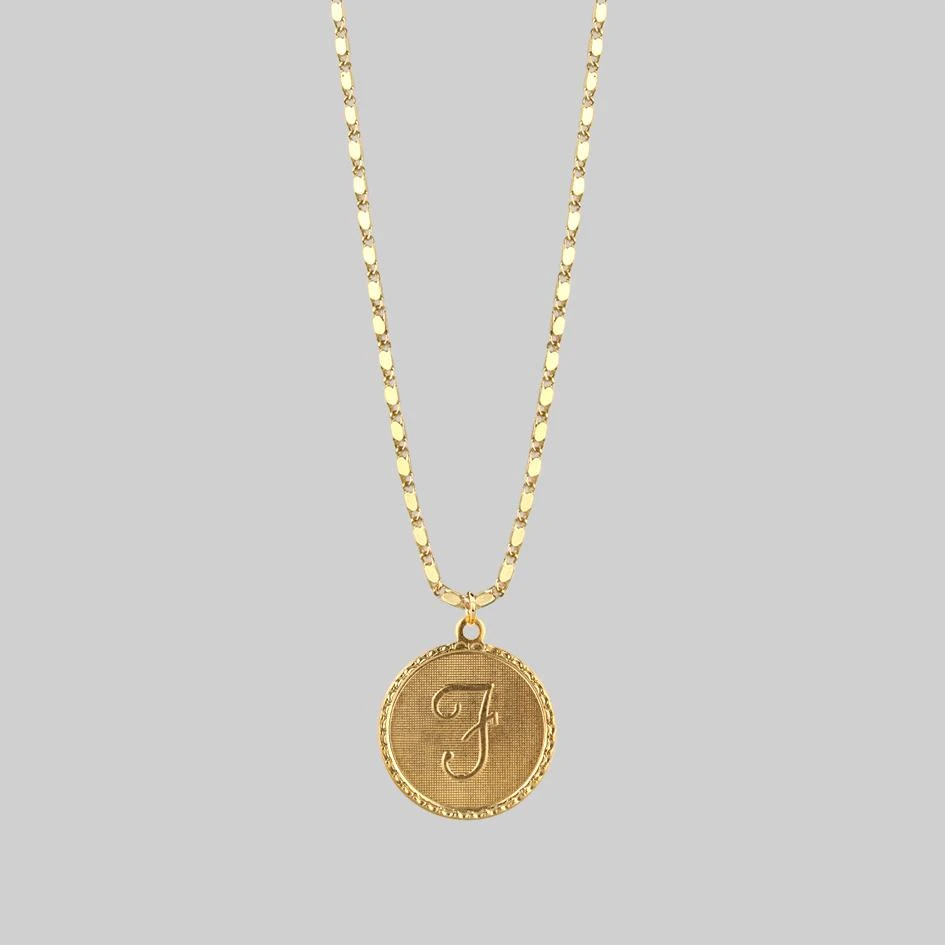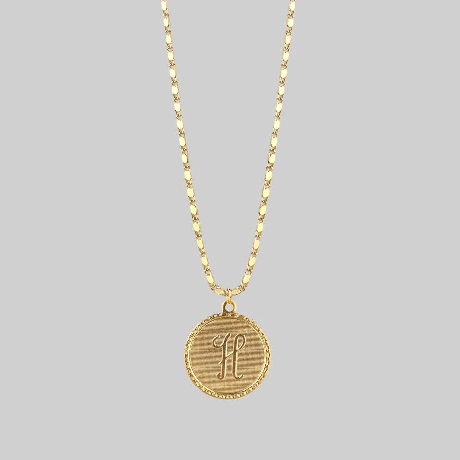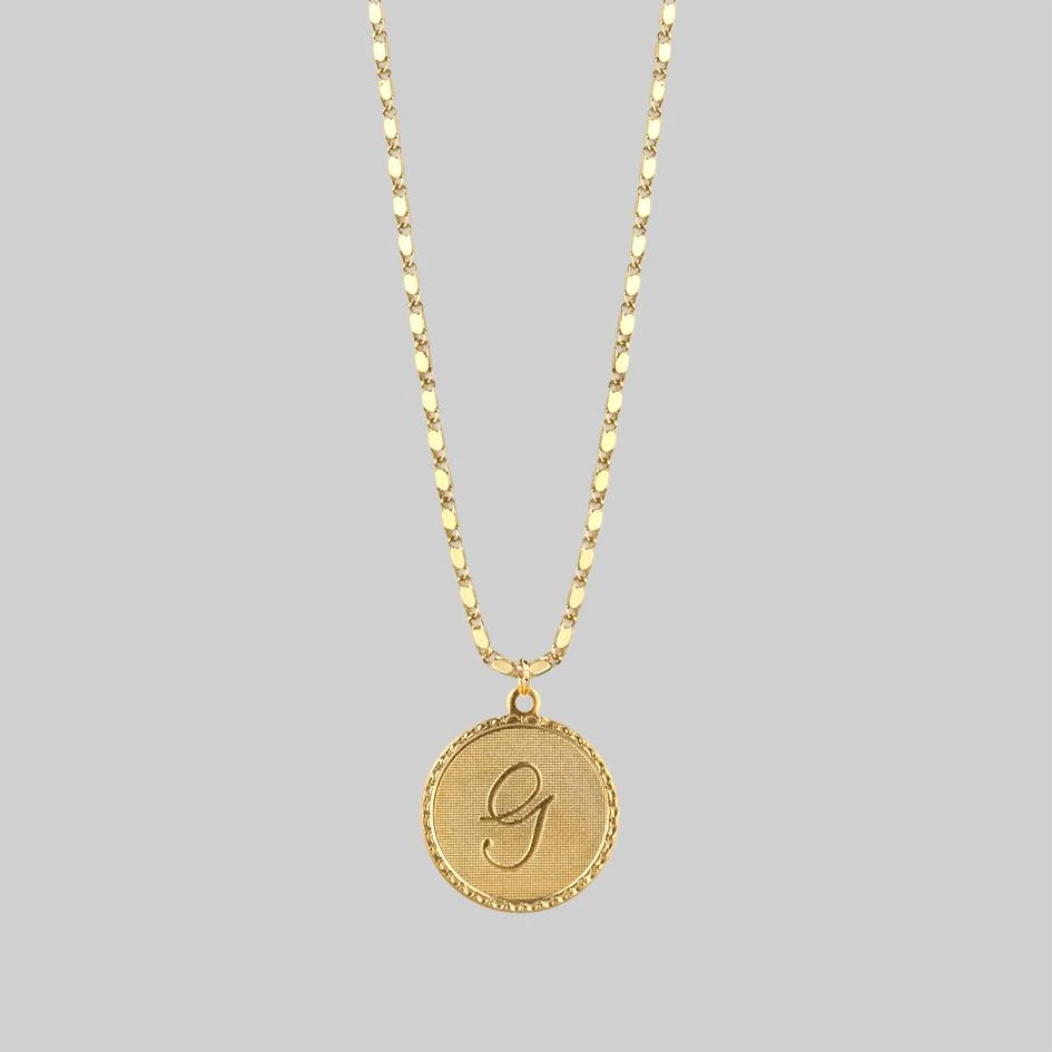Gold medallion necklace featuring a delicate script initial and sparkling chain.