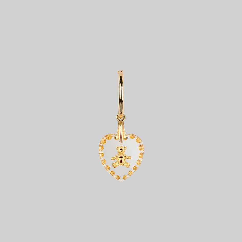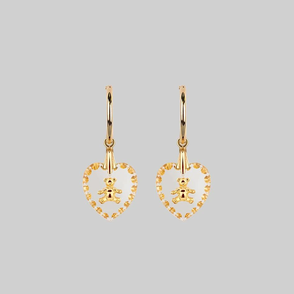 Vintage inspired scalloped edge glass heart Intaglios with adorable intricately engraved teddy bears hang from delicate sleeper hoop earring(s).