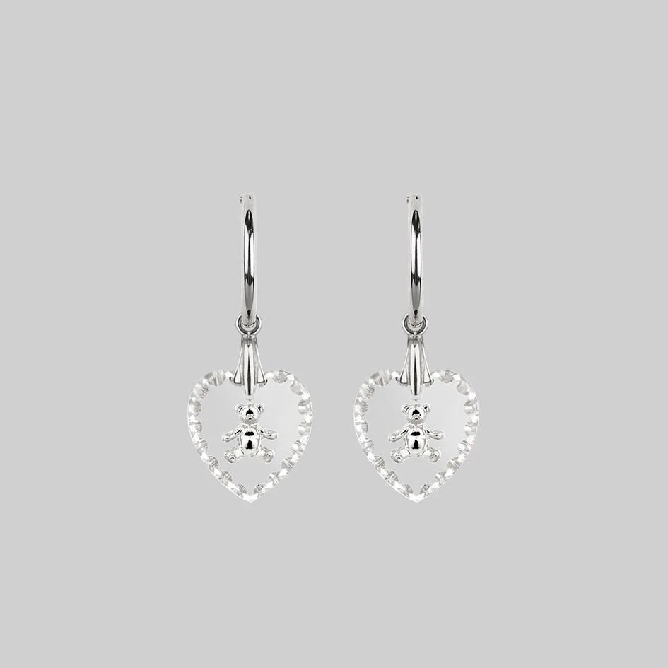 Vintage inspired scalloped edge glass heart Intaglios with adorable intricately engraved teddy bears hang from delicate sleeper hoop earring(s).