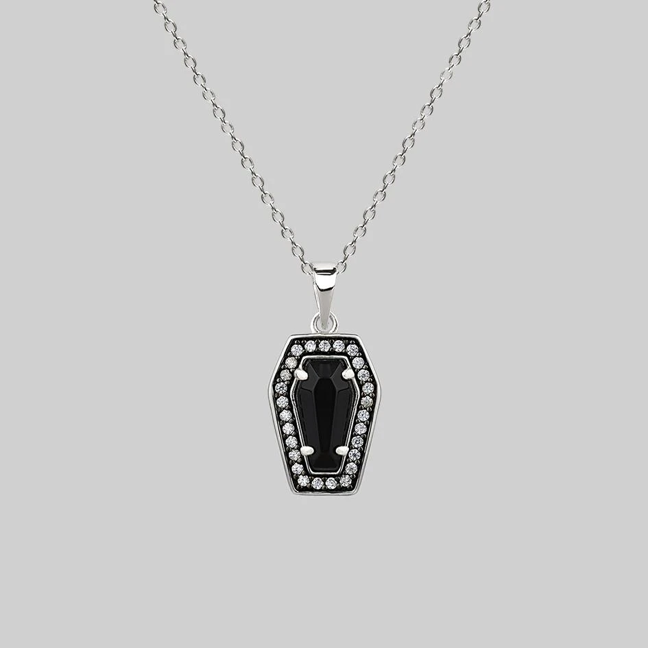 Deep black Onyx coffin shaped gemstone set within a frame of tiny Cubic Zirconia crystals, hangs on a delicate silver chain.