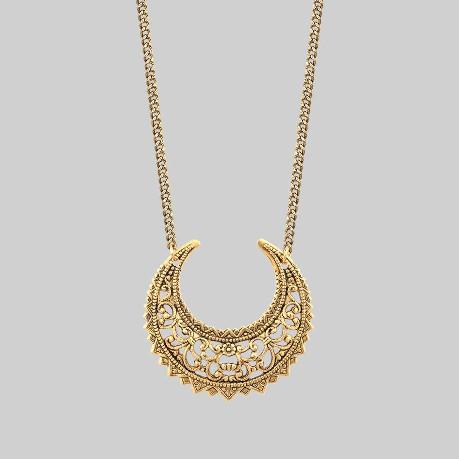 Beautifully intricate Eastern inspired crescent hangs on an adjustable chain.